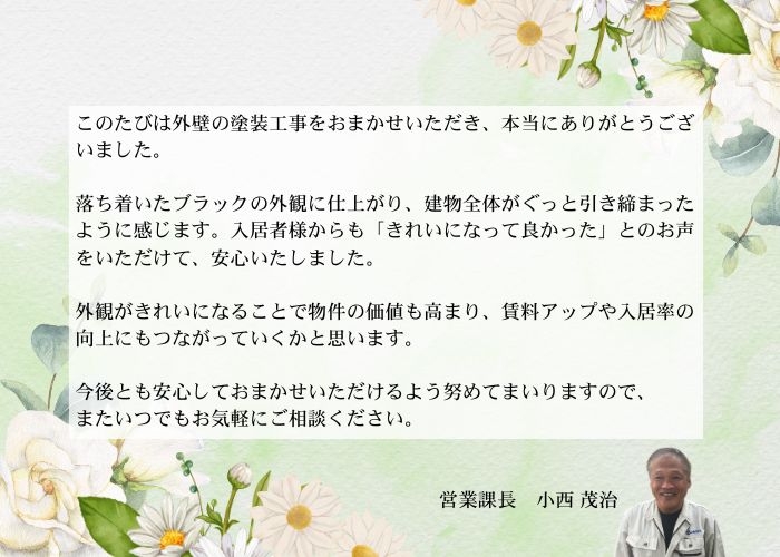 塗料には高耐久のプレミアムシリコン系塗料を採用し、見た目だけでなく耐候性・防汚性も向上しています。入居者様からも「きれいになって良かった」と嬉しいお声をいただきました。