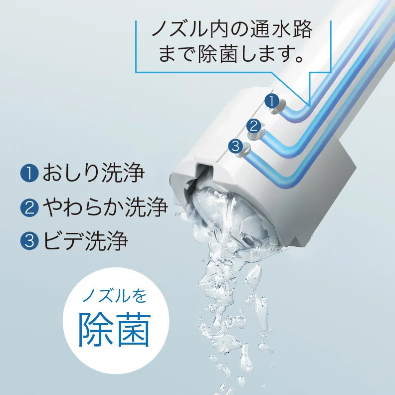 「ウォシュレット」使用前後に水でノズルを洗浄する「セルフクリーニング」に加え、トイレ使用後には「きれい除菌水」がノズルの内側も外側も自動で洗浄・除菌。待機中にも定期的に洗浄し、ノズルのきれいが長持ちします。
