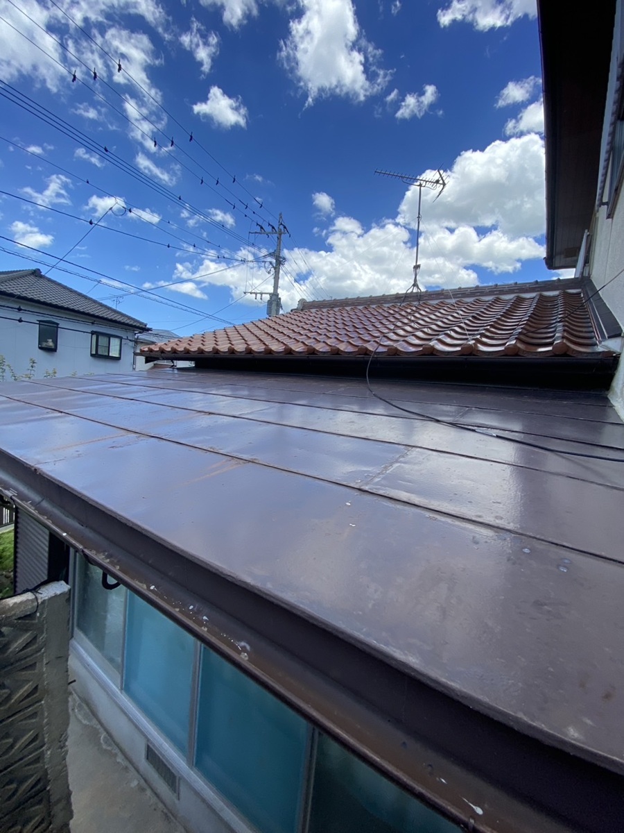 下屋の板金屋根も、経年による退色や小さなサビが見られました。