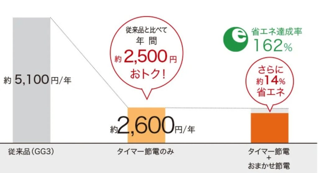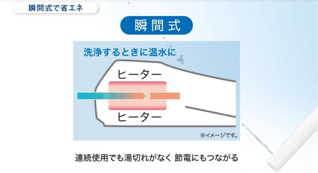 最大の特長は、瞬間式温水洗浄便座を採用していること。使用するたびに瞬時にお湯をつくる仕組みで、連続使用でも常に快適な温水が使えるうえ、タンクでお湯を保温し続けるタイプに比べて待機電力を大幅にカットできます。