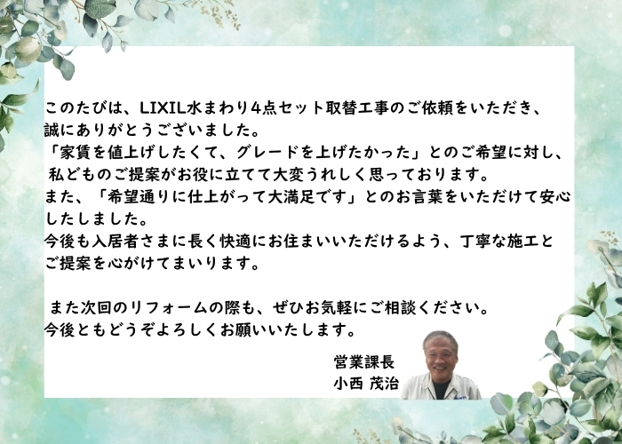 「きれいで使いやすい」と好評のLIXIL4点セットで清潔感が長持ちし、末永く住んでもらえる 賃貸物件になりました♪