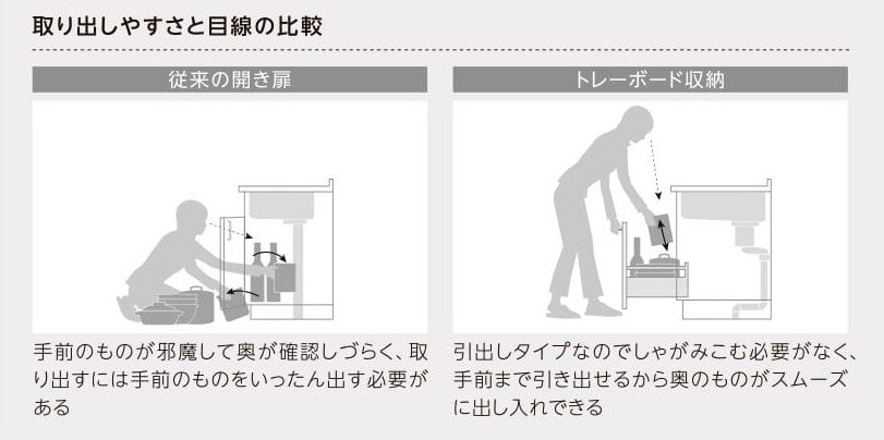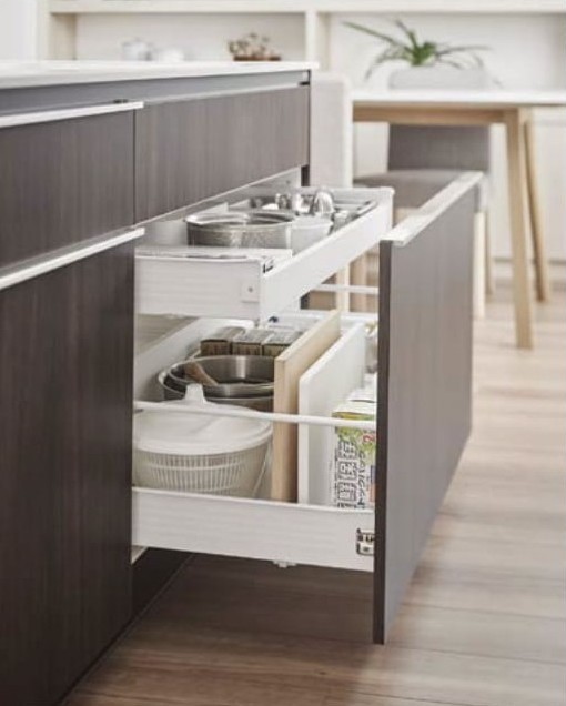 開き戸タイプより価格は少し上がりますが、奥にしまった鍋や調味料もラクに出し入れでき、日々の使いやすさと快適さは何ものにも代えがたい魅力です。