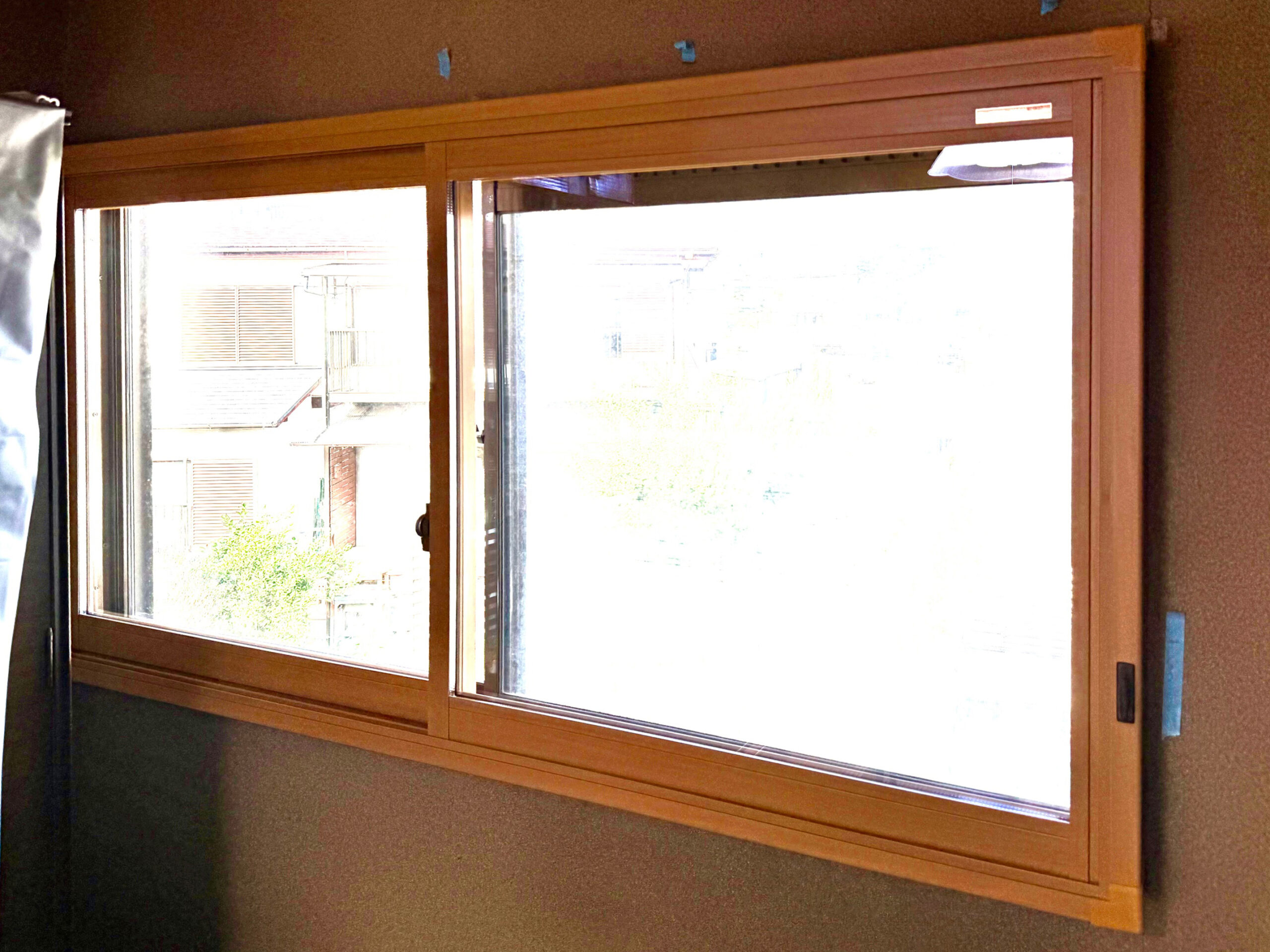 施工前の窓には、冷気対策としてビニール製のカーテンが取り付けられていて、冬場の寒さや外気の影響を感じやすい状態でした。