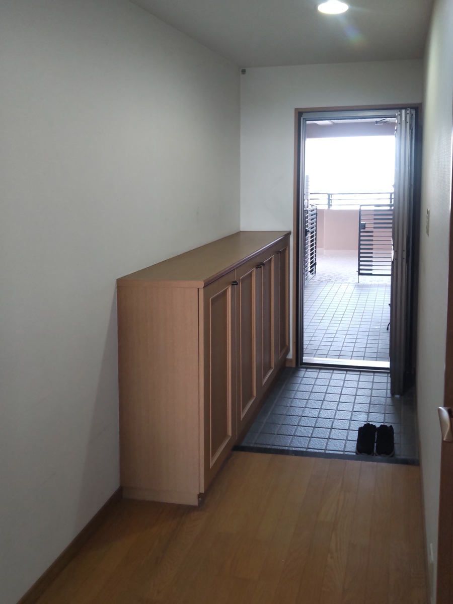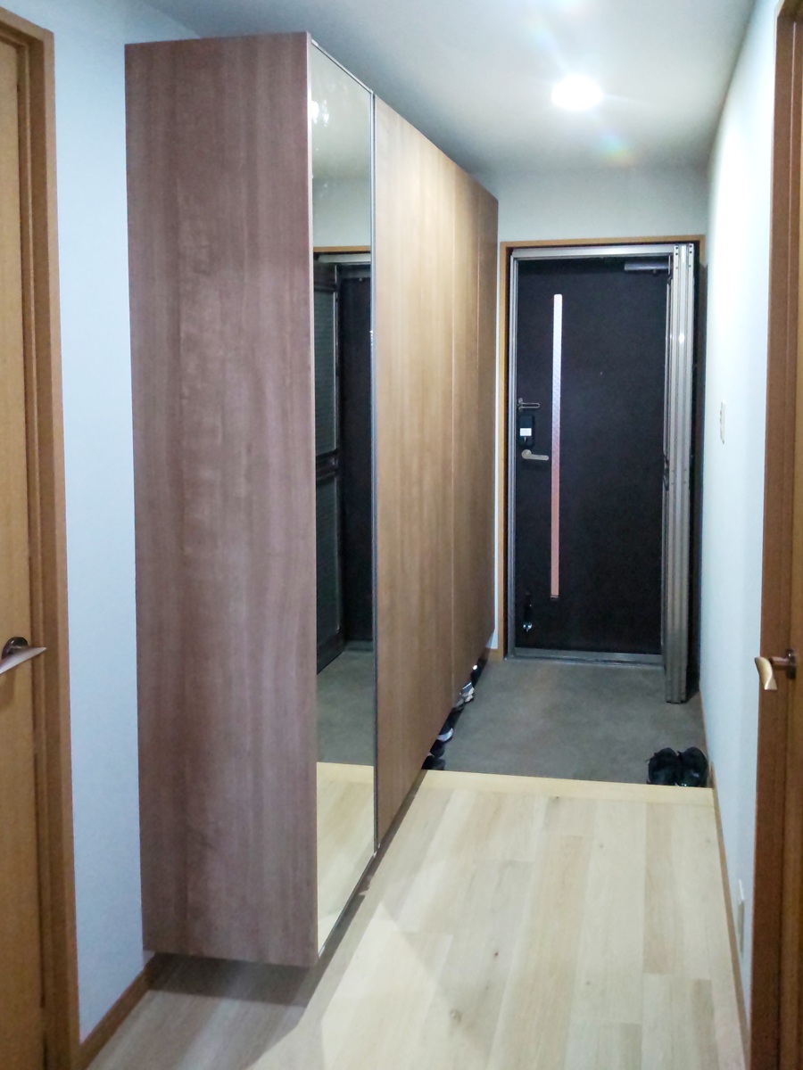 従来の小さな下駄箱では収まらなかった靴・掃除用品・傘・上着・ストック品まで収納できるようになり、玄関がすっきり整いました。