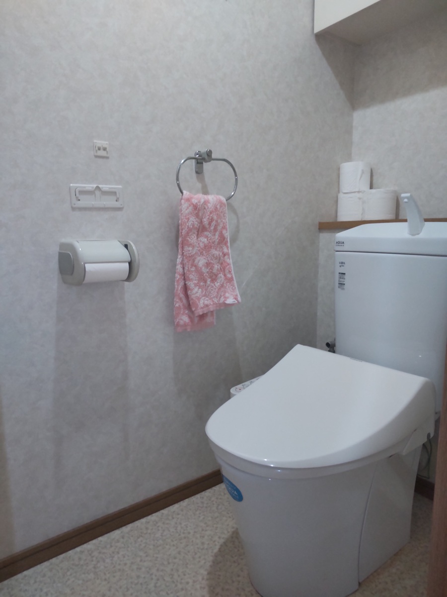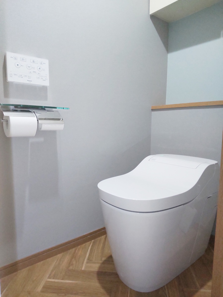 タンク付きトイレから、スッキリとしたタンクレスタイプなったので、トレイが広く見えるようになりました。