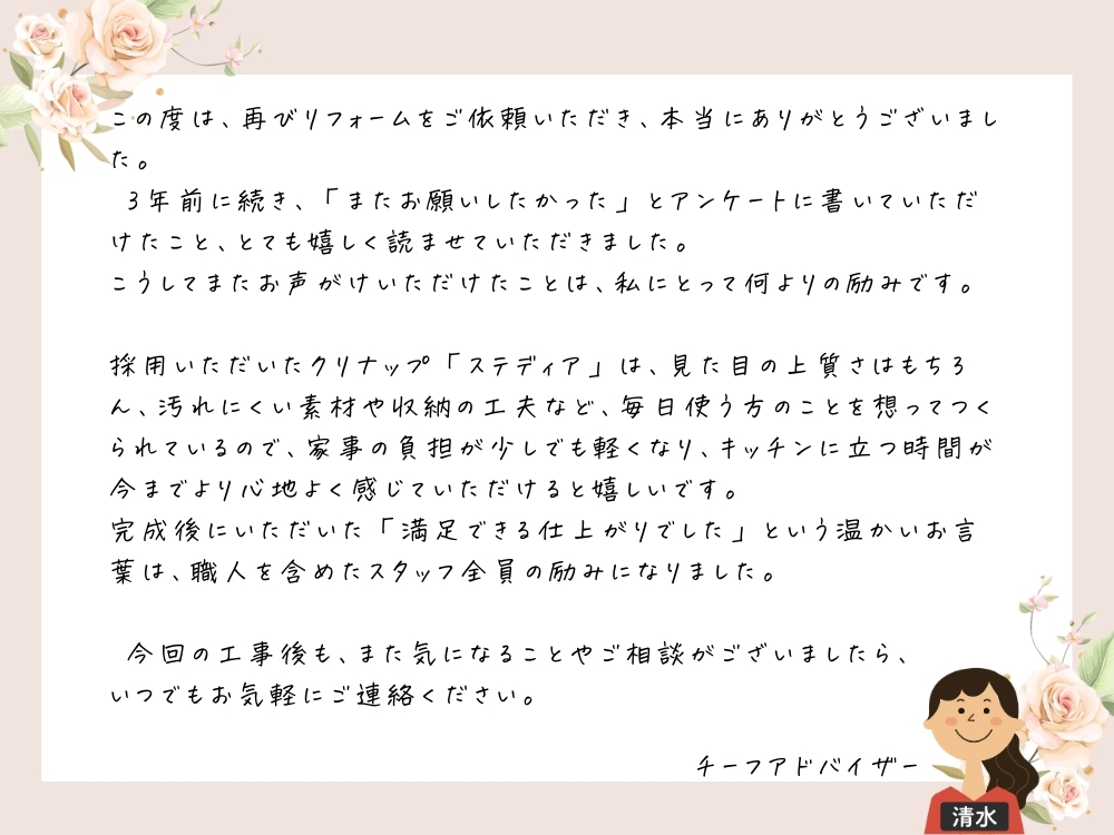 キッチンだけでなく、収納・和室建具・トイレ・玄関までトータルで見直したことで、使いやすさ・デザイン性・清掃性が大きく向上しました。