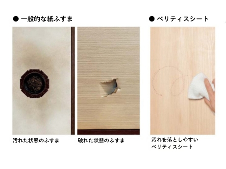 一般的な紙ふすまに比べて、傷がつきにくく丈夫な「ベリティスシート」素材を使用していて、汚れてもサッと拭くだけでお手入れが完了します。
