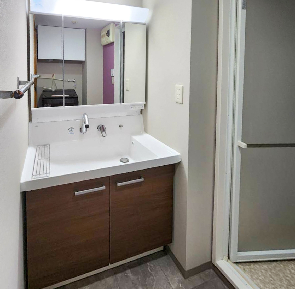 収納のない一面鏡から、鏡裏に収納できる三面鏡タイプへ変更したことで、日用品がすっきり収まり、洗面室全体が整った印象になりました。