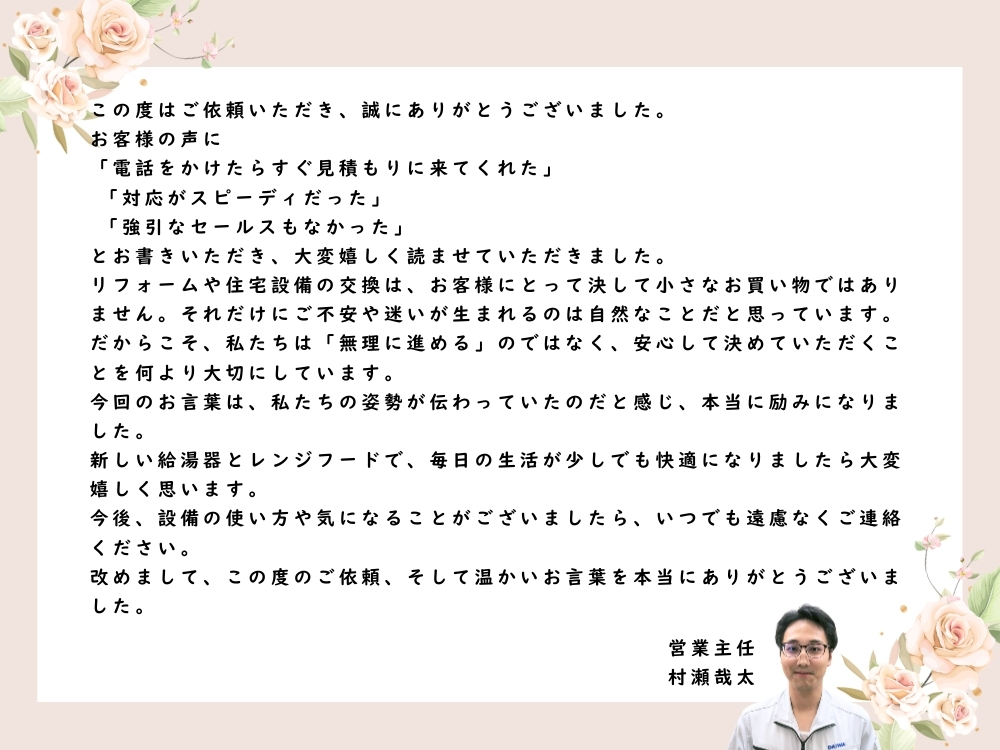 今回は安全面と今後の安心を考え、最新型給湯器への交換をご提案いたしました。