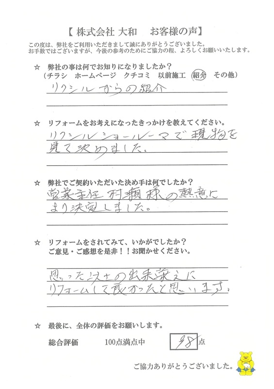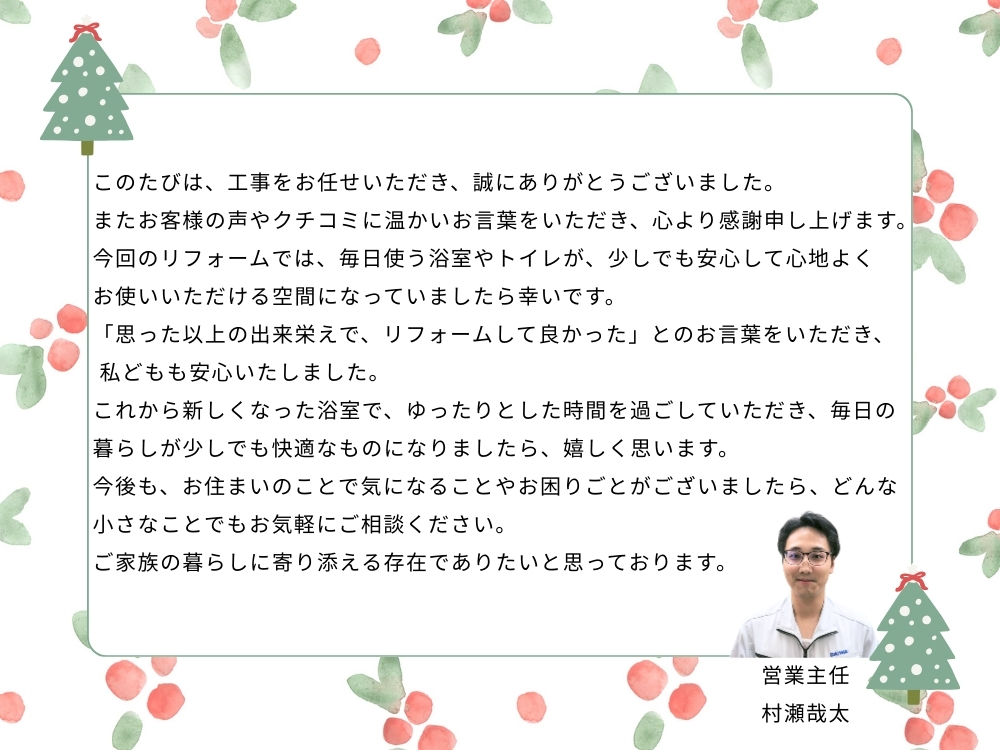 | リフォーム箇所 | 浴室、内窓(浴室内窓)、トイレ(1階・2階)、エコキュート、 |
