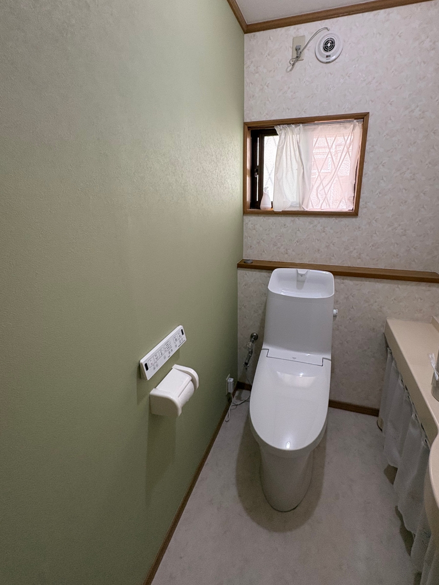 1階トイレは収納棚を撤去して空間をすっきりと整え、淡いグリーンのアクセントクロスが木目の枠や棚と調和する、やさしく落ち着いたトイレ空間に。