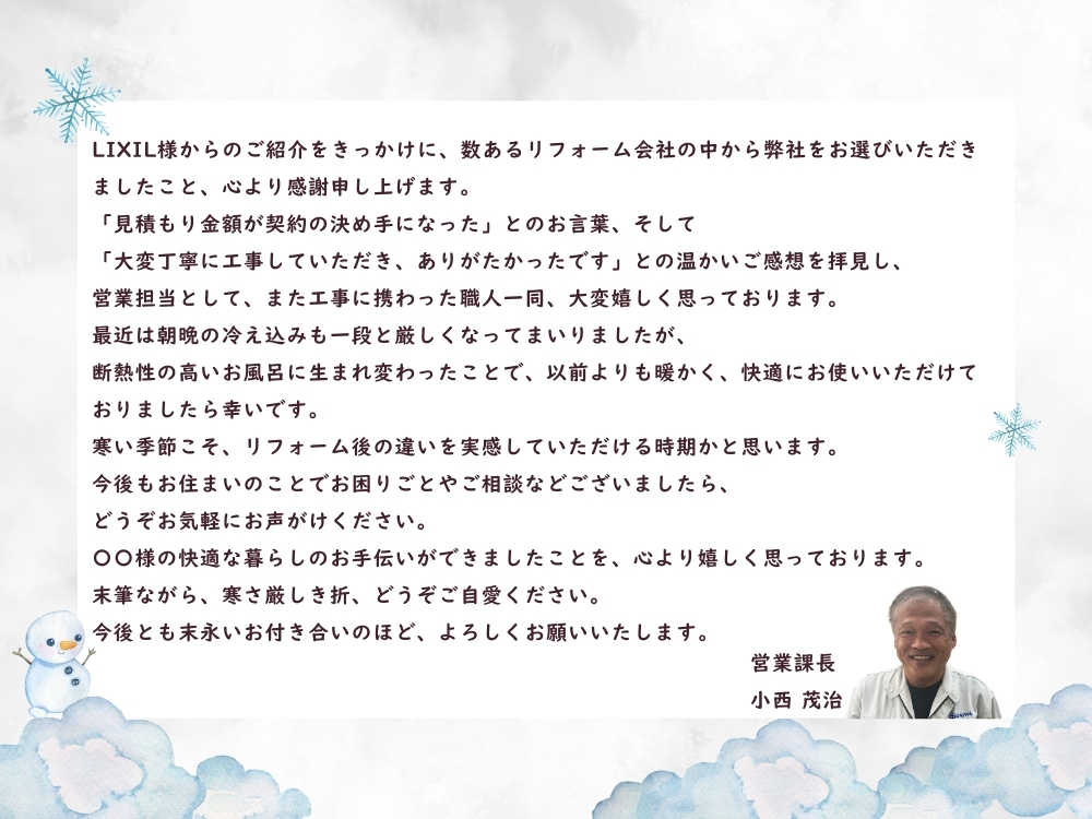 外気の影響を受けにくくなり、冬でも冷えにくい快適な浴室空間となりました。
