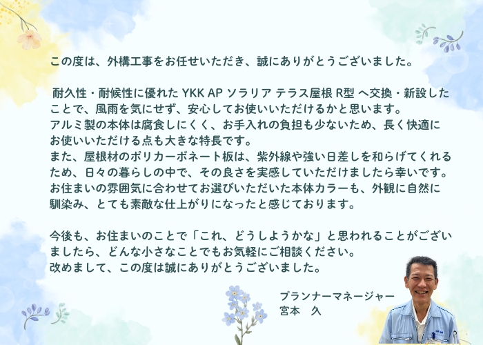 YKK AP ソラリア テラス屋根 R型 に交換・新設しています。