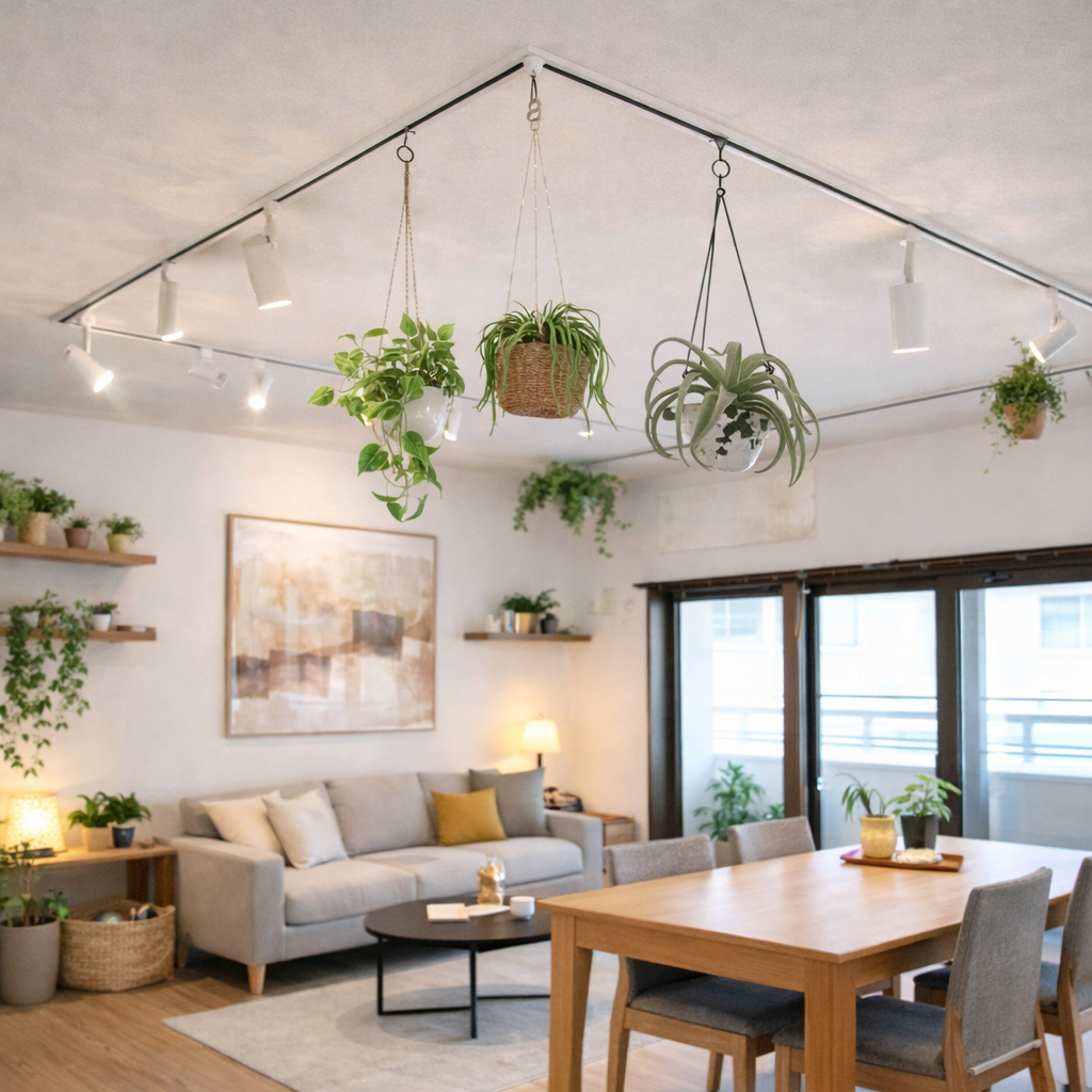 また、ダクトレールには照明だけでなく、観葉植物やインテリア雑貨を吊るしてディスプレイすることも可能。
