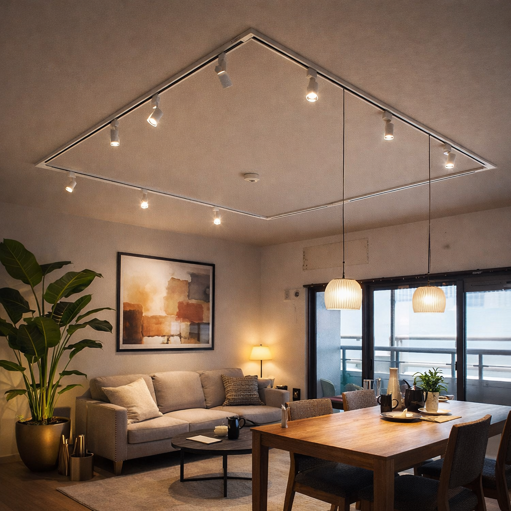 レールを四角く回すことで、部屋全体を包み込むように明るさを確保でき、空間に一体感が生まれます。