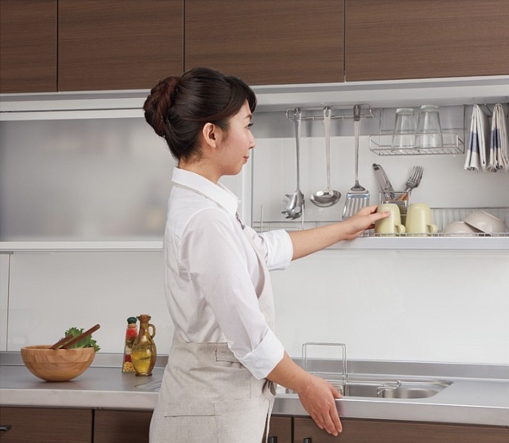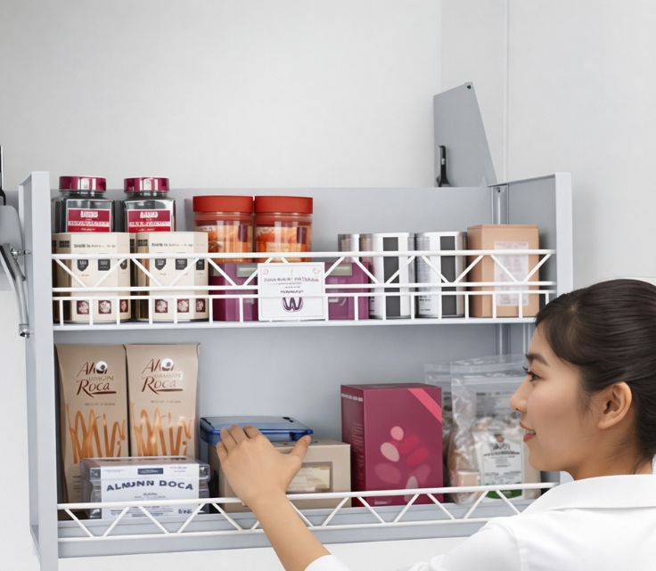 吊り戸棚には、オプションで目線の高さまで下りてくる 昇降式吊り戸棚(ミドルウォール) を設置。