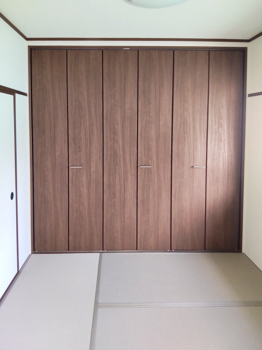 出入口の襖は、木目調のおしゃれな引戸へ変更。
