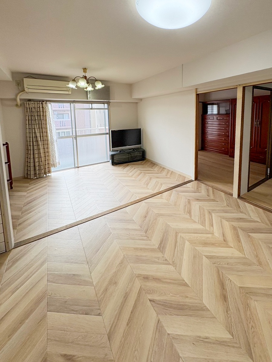 リビング・ダイニングと廊下は、クッションフロアを淡い色合いのヘリンボーン柄へ貼り替えました。
