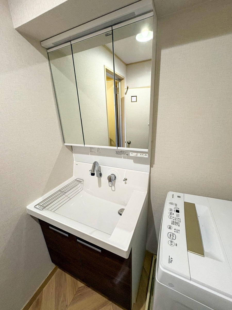 三面鏡の裏収納に加え、洗面ボウル横にも物が置けるため、洗面まわりがすっきり片付き、使い勝手も向上しました。
