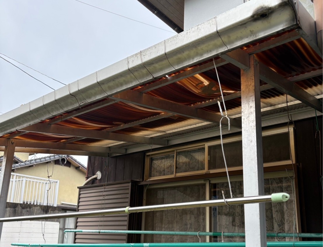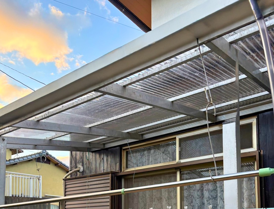 施工前は、波板がたわみ、雨水がたまりやすくなっていたほか、隙間もあり、雨漏りの不安がありました。また、光を通しにくい波板で、日中でも軒下が暗く感じられていました。