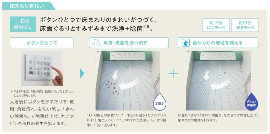 さらに、オプションで「床ワイパー洗浄(きれい除菌水)」を設置しました。床の石けんカスや皮脂汚れを自動で洗い流し、菌やカビの増殖を抑えてくれるため、日頃のお手入れの負担も軽減されます。