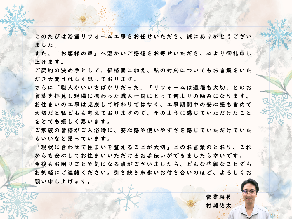 ご家族の見守りの中でも安心して使える、やさしい浴室へと生まれ変わったリフォーム事例となりました。