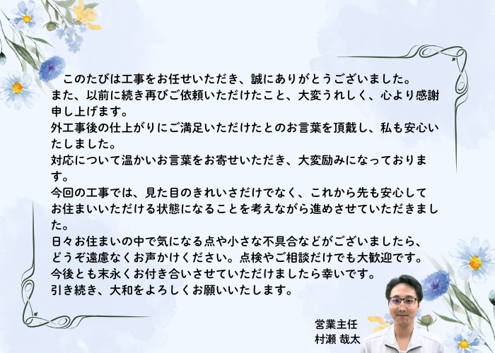 工事後には「仕上がりが綺麗になり大変満足しています」との温かいお言葉もいただき、長くお付き合いいただいているお客様のお住まいを、今回もお手伝いできたことを大変うれしく思います。