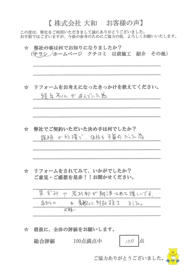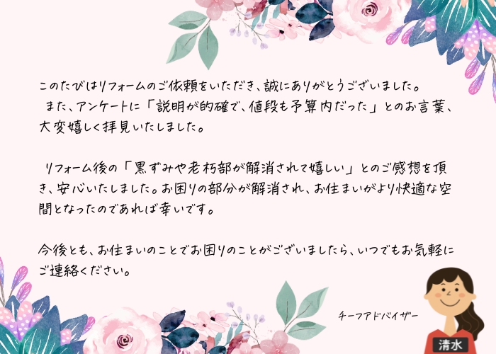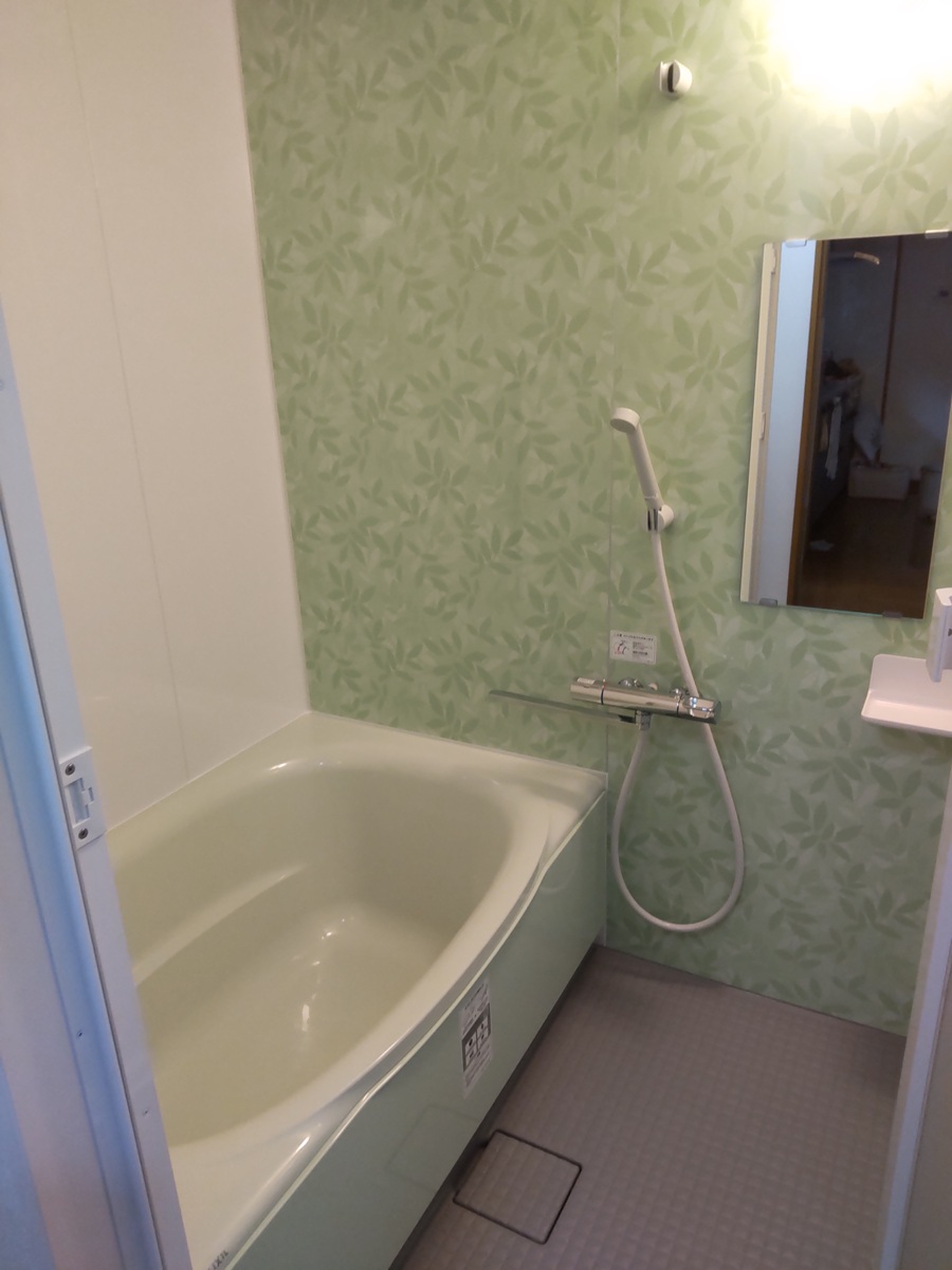 | 仕様材料 | 浴室工事:LIXIL リノビオV Eタイプ(1216サイズ)(アクセントパネル:グリーンリーフ×鏡面ホワイト、浴槽カラー:グリーン、床カラー:グレー、収納カラー:ホワイト) トイレ:LIXILアメージュ便器(リトイレ)、シャワートイレKB31、換気扇三菱VD10ZSJ14 壁・天井クロスSP2602、床CF:HM17148 |