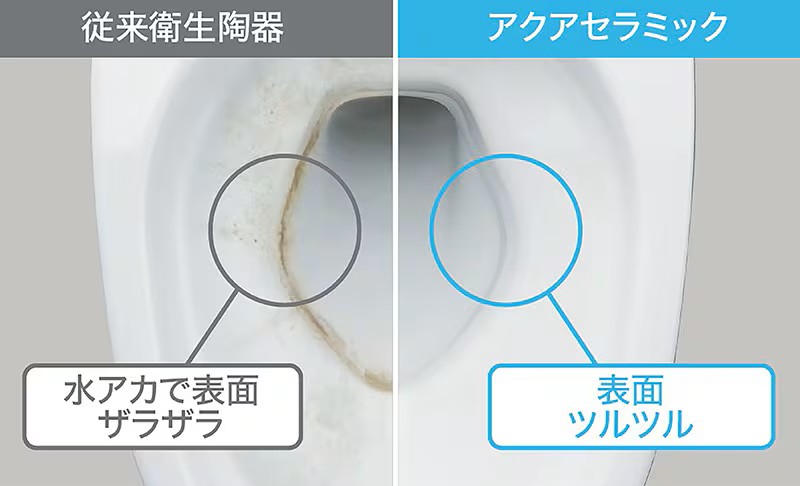 通常の陶器表面は微細な凹凸があり、水アカや黒ずみ(カビ・菌)が付着しやすいですが、アクアセラミックは表面が非常に滑らかで水になじみやすく、汚れの下に水膜が入り込むため、汚れがこびりつきにくく、軽く流すだけでツルッと落ちるのが特徴です。