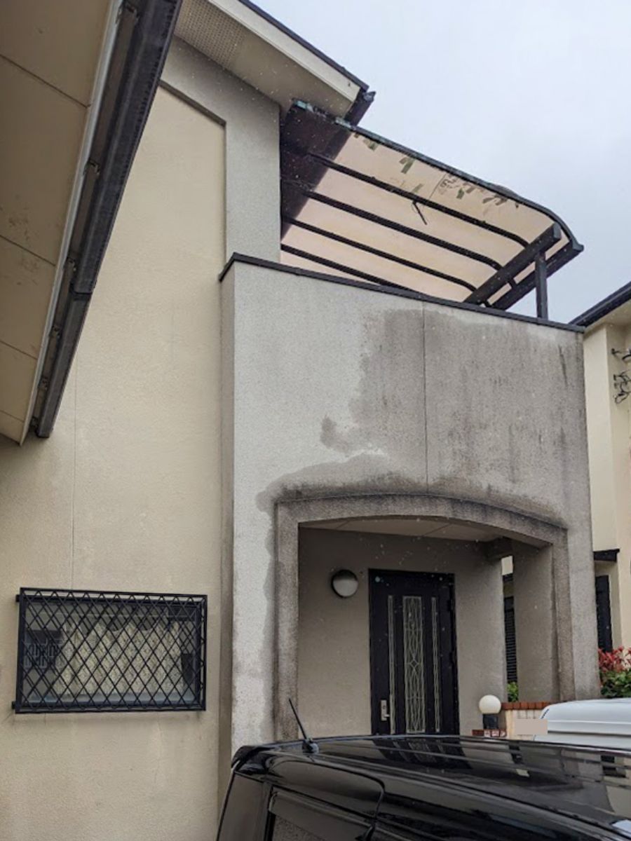 特に玄関の上にあるベランダの外壁には雨水のシミが広がり、建物全体の印象が暗く感じられる状態に。