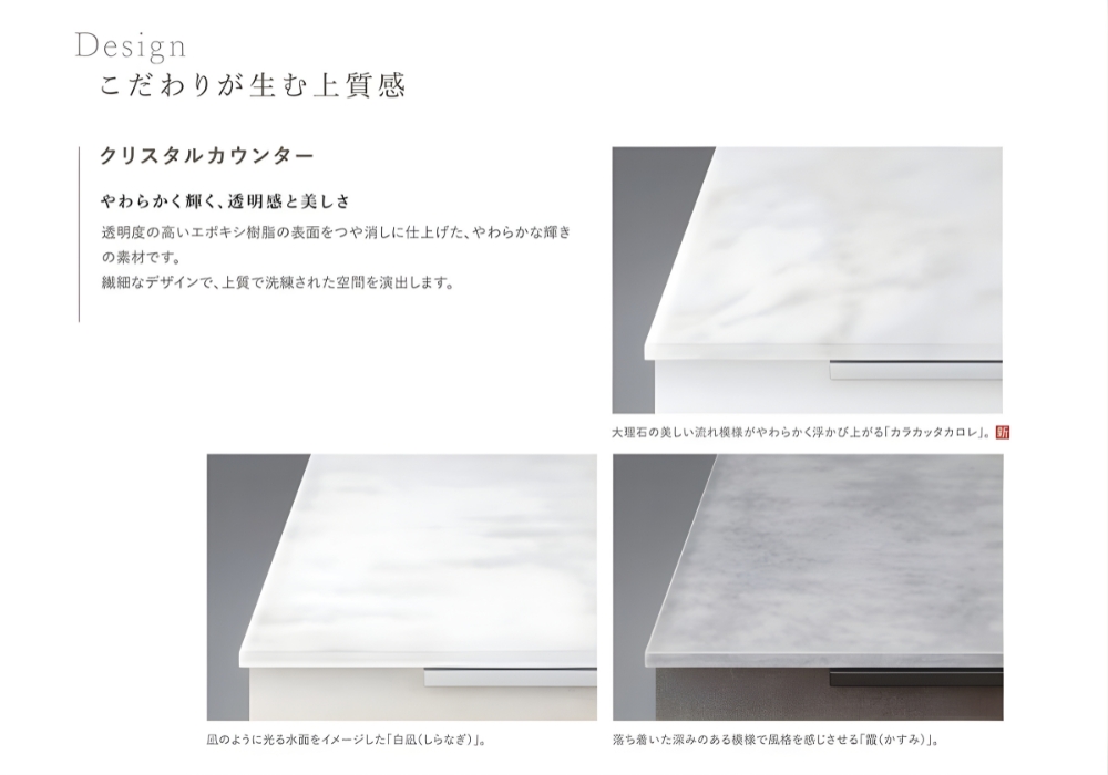 光を受ける角度で輝きが変わる、クリスタルカウンターはまるで宝石のような深みのある質感が特徴的です。